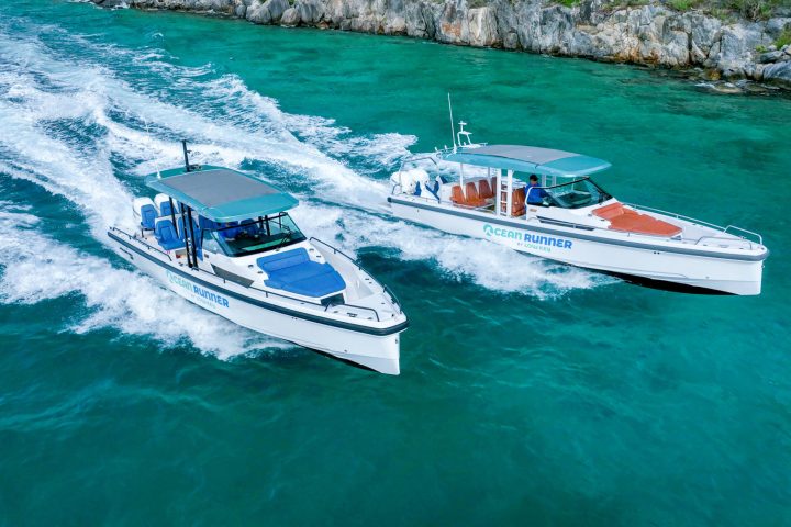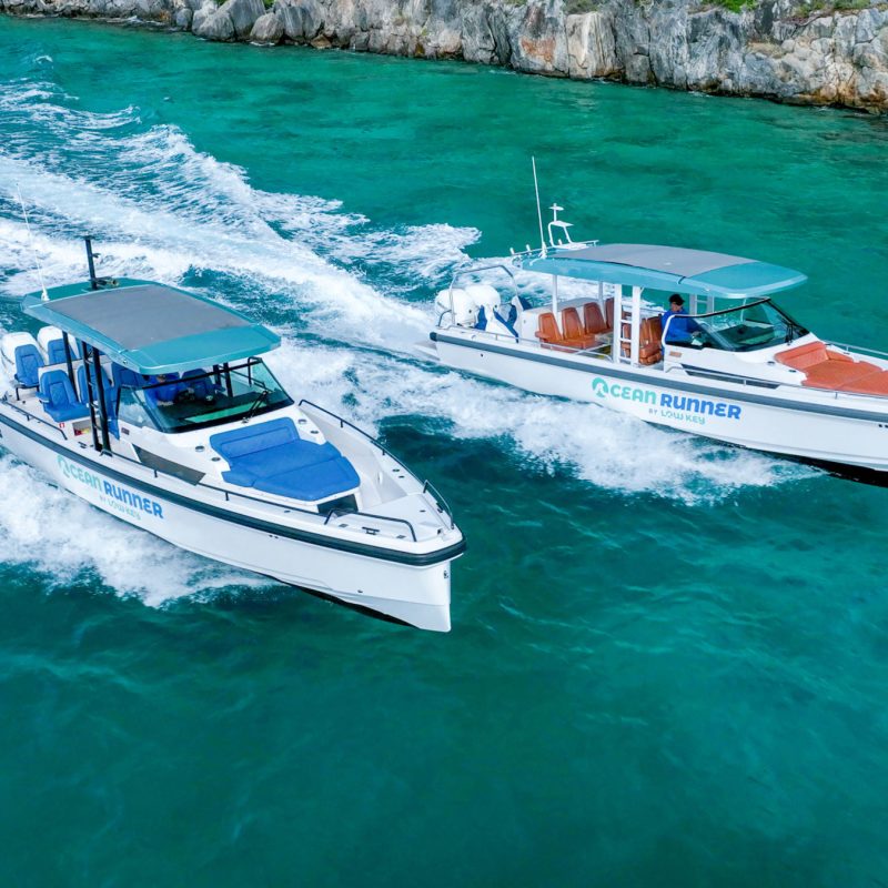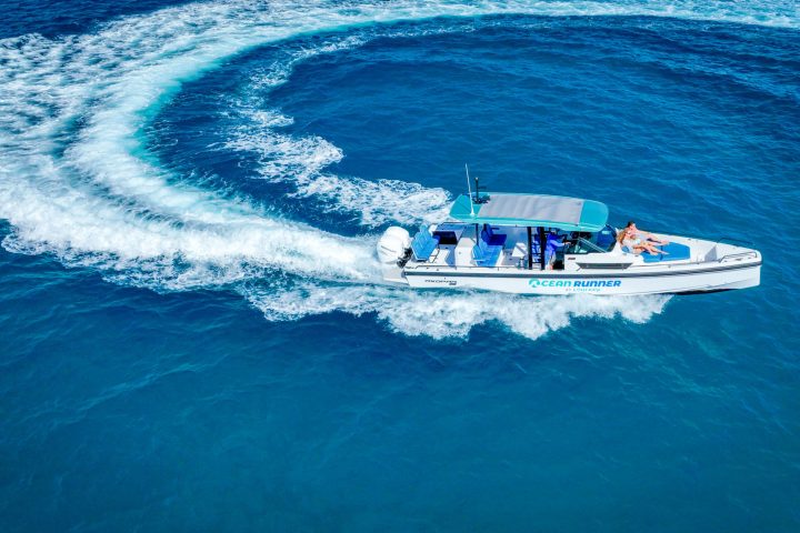 The Axopar private charters have ample seating for 11 passengers. These boats include a lounging sun bed in front and dining table with swivel seating as well as a full cabin with a private bathroom. The expansive hard top provides plenty of shade for you and your passengers, but retracts for additional sunshine. Each boat contains snorkel gear and an insulated cooler stocked with water, sodas and beer. Their unique hulls and twin Mercury engines with combined 600 HP provide an exceptionally smooth ride. You can even put on your favorite playlist while on the water using the boat’s sound system with Bluetooth capability.